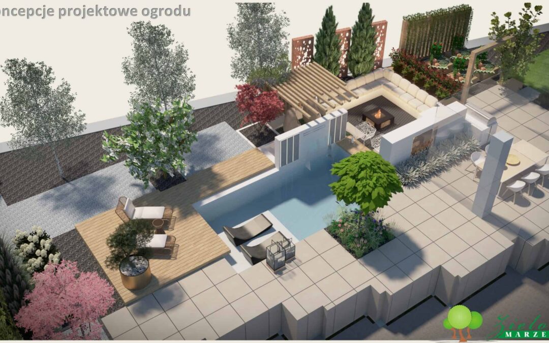 Projektowanie ogrodów – Koncepcja projektowa 1 Koncepcja projektowa ogrodu z basenem i miejscem na ognisko we wgłębniku